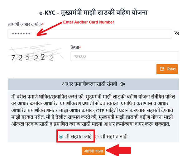 • अब आपको अपना आधार कार्ड नंबर, कैप्चा कोड व मी सहमत आहे पर टिक करके “ओटीपी पाठवा” पर क्लिक करना होगा।